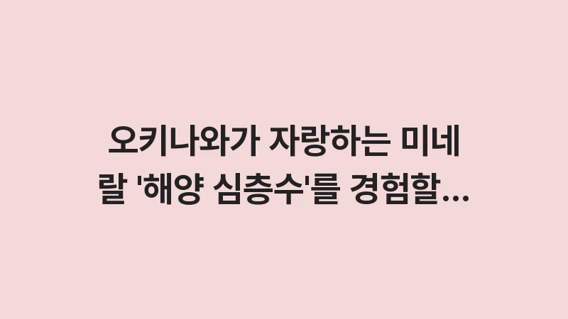 오키나와 해양 심층수 시설 TOP 3를 소개합니다. 피부 진정과 면역력 강화에 좋은 미네랄 심층수를 경험할 수 있는 리조트 스파, 연구 시설의 위치와 비용, 이용 팁까지 상세히 정리했습니다. 오키나와의 숨겨진 치유 에너지를 만나보세요. … 더 읽기.
