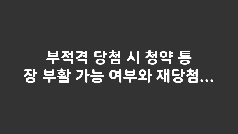 부적격 당첨 시 청약 통장 부활 가능 여부와 재당첨 제한 기간은? 단순 실수로 당첨이 취소되었을 때 청약 통장의 효력을 살리는 방법과 재당첨 제한 기간을 최소화하는 구제 절차를 상세히 정리했습니다. 기회를 완전히 잃지 마세요. … 더 읽기.
