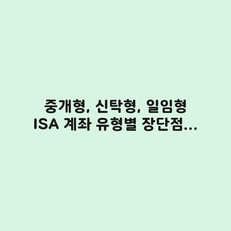 ISA 계좌 유형별 장단점 비교 (중개형, 신탁형, 일임형)를 통해 나에게 맞는 계좌를 찾는 완벽 가이드. 직접 투자, 예금 선호, 전문가 일임 등 투자 성향에 따른 최적의 ISA 선택법을 제시합니다. … 더 읽기.