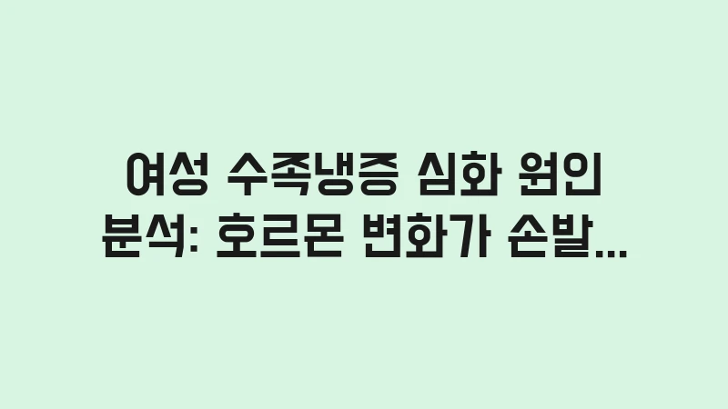 D씨의 사례에서 알 수 있듯, 여성의 냉증은 호르몬이라는 거대한 흐름과 함께 다뤄져야 합니다. 수족냉증 원인과 혈류 개선 가이드 (여기서 확인)를 통해 자신의 생애 주기에 맞는 맞춤형 전략을 세우는 것이 중요합니다.
